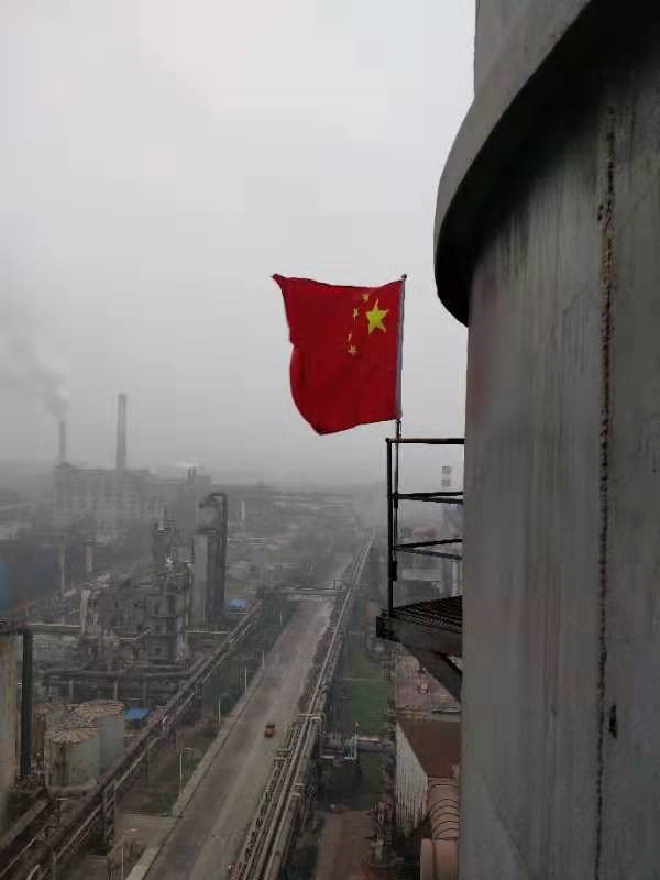 紅旗在吸收塔上迎風(fēng)飄揚(yáng)