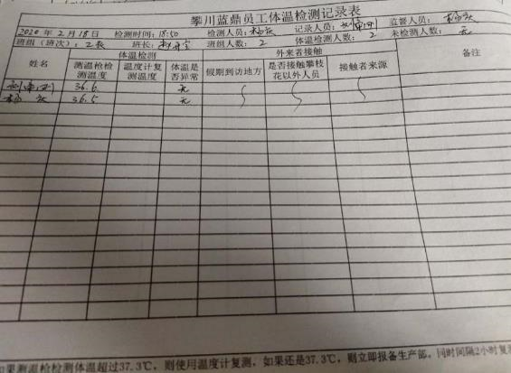 根據(jù)區(qū)政府要求,川藍(lán)鼎迅速對(duì)春節(jié)期間離攀員工進(jìn)行了全面排查,對(duì)員工春節(jié)期間的外出動(dòng)向和外來(lái)人員接觸情況都明確、詳細(xì)的登記在案。對(duì)員工身體狀況,公司力求做到隨時(shí)了解員工身體狀況,調(diào)往脫硫的員工每日跟隨脫硫班組檢測(cè)體溫等身體狀況,留守粉線的人員也與脫硫班組完全同步檢測(cè)。