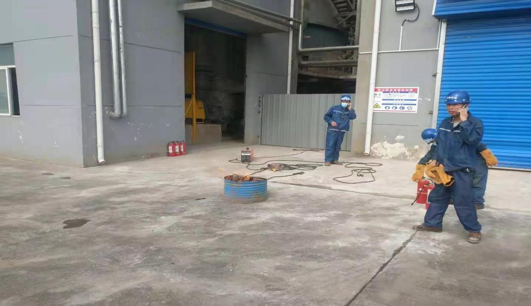 隨著演練人員各就各位,應(yīng)急演練總指揮游部長宣布演練開始:在200㎡燒結(jié)脫硫脫硝脫硫塔,檢修工在脫硫塔內(nèi)焊接2#循環(huán)泵噴頭支撐梁與檢修梁,噴淋管遇到高溫焊渣,積聚熱量起火,煙霧升起,組員報(bào)告組長,組長及時打電話報(bào)告演練總指揮。同時組織小組成員在保證安全的情況下展開滅火自救,總指揮一聲令下啟動應(yīng)急救援預(yù)案,同時向建龍公司報(bào)告情況,通知119。各應(yīng)急救援小組積極響應(yīng),忙而不亂,井然有序全副武裝投入滅火搶救,維護(hù)組及時隔離警戒,搶救組沖入200㎡脫硫塔救人,及時送往醫(yī)院,搶險(xiǎn)組拿起滅火器沖向起火點(diǎn),119及時趕到徹底撲滅火災(zāi)。事故處理小組對事故現(xiàn)場進(jìn)行了證據(jù)采集和事故調(diào)查。
