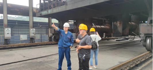 第二組在生產(chǎn)部副部長王建勇的帶領(lǐng)下來到了煉焦的生產(chǎn)現(xiàn)場推焦機旁,針對現(xiàn)場重主要設(shè)備的名稱及作用進行行詳細(xì)了解。