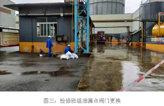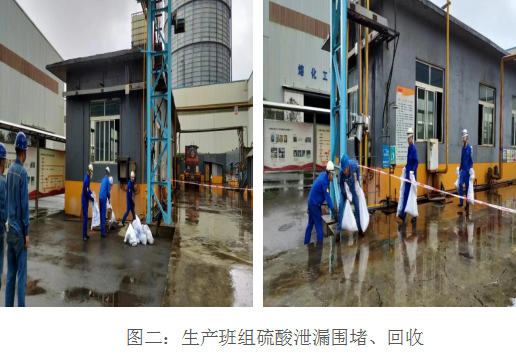 本次演練模擬硫酸卸車泵房硫酸管道泄漏,14:00當班兩名酸堿工巡查酸堿管網(wǎng)時發(fā)現(xiàn)酸堿卸車區(qū)閥門滲漏;現(xiàn)場人員立即通知當班班長,班長立即組織人員準備急救物資;14:02當班班長趕到現(xiàn)場查看滲漏情況后立即組織人員用應(yīng)急沙進行圍堵并安排人員拉好警戒線維持好現(xiàn)場次序;14:03當班班長將情況匯報調(diào)度室,同時通知檢修到場,調(diào)度室第一時間通知安全環(huán)?;14:05檢修到現(xiàn)場確認情況,制定出檢修方案并開始檢修,同時現(xiàn)場監(jiān)護人員確認檢修防護用品是否穿戴完整;14:15經(jīng)過檢修搶修后現(xiàn)場試車確認,無滲漏,匯報相關(guān)領(lǐng)導(dǎo)同時把地面污染物進行清理;14:25經(jīng)過相關(guān)領(lǐng)導(dǎo)確認后,無滲漏,同意恢復(fù)生產(chǎn);14:28匯報調(diào)度,調(diào)度室通知恢復(fù)正常生產(chǎn)。